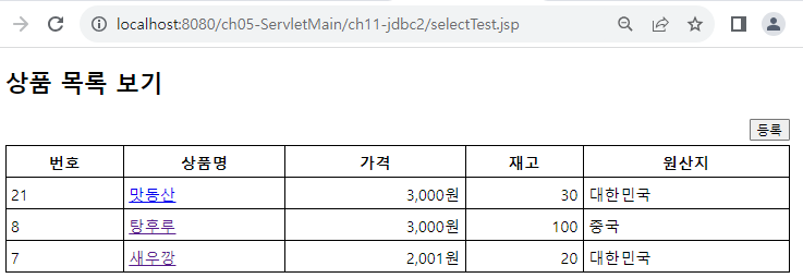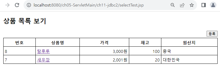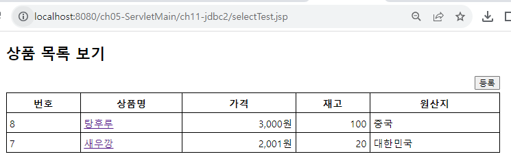 목록 보기 누르면 selectTest.jsp 에서 추가된 항목을 볼 수 잇다.