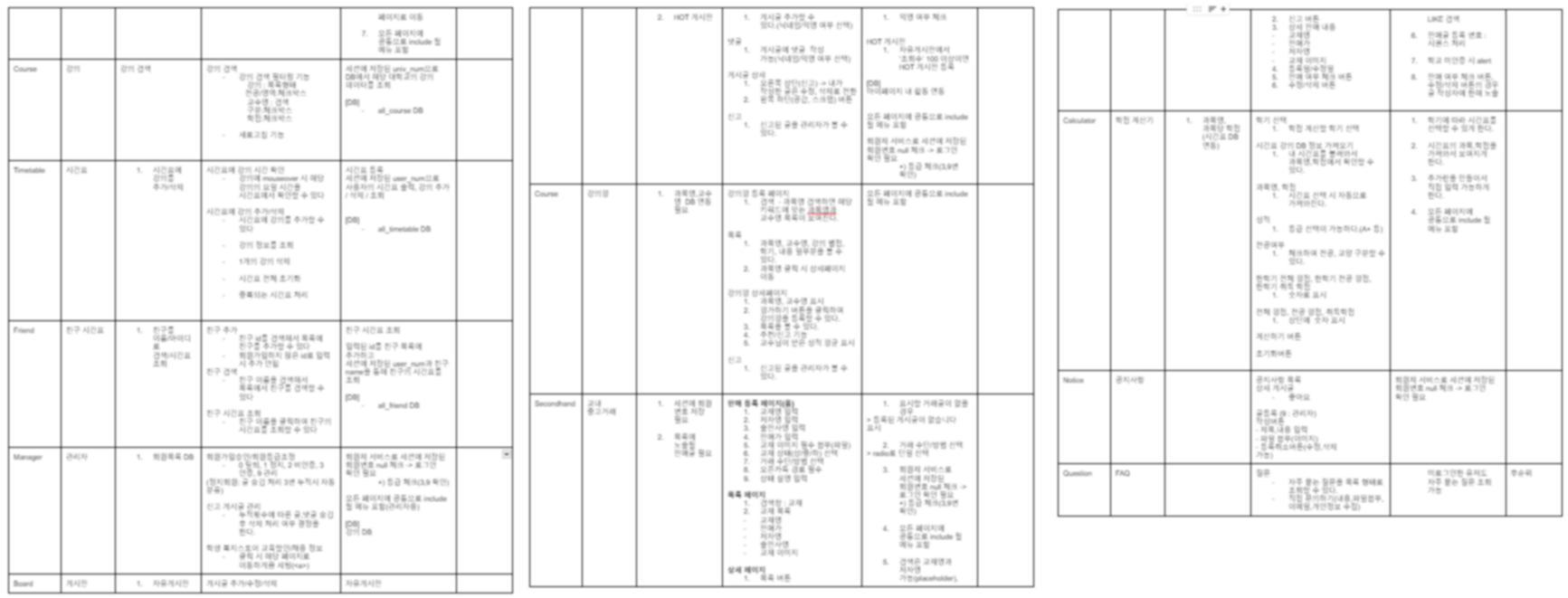 처음에는 게시판/강의평/학점계산기/책방을 내가, 마이페이지 기능 1명, 관리자 기능 1명, 시간표 1명, 회원가입/메인 1명 이렇게 기능을 나누었다. 나는 책방 기능까지 하려고 했지만, 프로젝트 개발 기간이 2주밖에 되지 않는다는 공지를 듣고 다른 팀원에게 맡기게 되었다.
