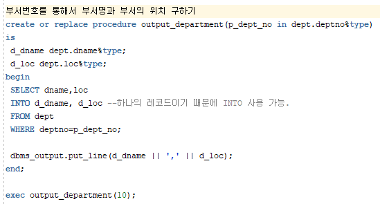 INTO d_dname, d_loc --하나의 레코드이기 때문에 INTO 사용 가능.