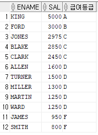 WHEN sal>=1000 AND sal<2000 THEN 'D'
