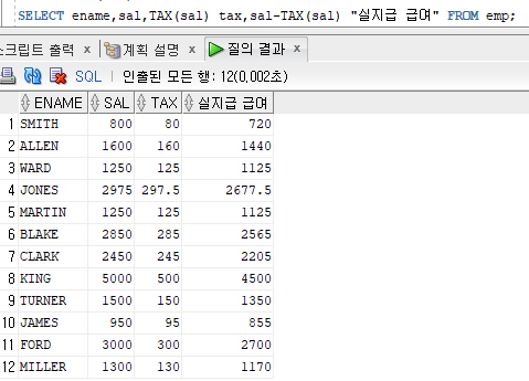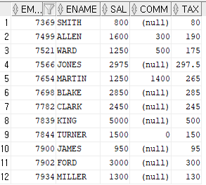 select empno,ename,sal,comm, TAX3(sal,comm) AS tax FROM emp;