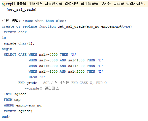 5)emp테이블을 이용해서 사원번호를 입력하면 급여등급을 구하는 함수를 정의하시오.